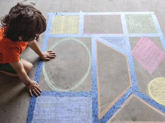 Shapes are a close second to my son’s love of numbers. One day, I taped off a small design on the patio using painter’s tape — something a little artsy, of course. But he was too impatient to wait for “perfect.” So I winged it.
